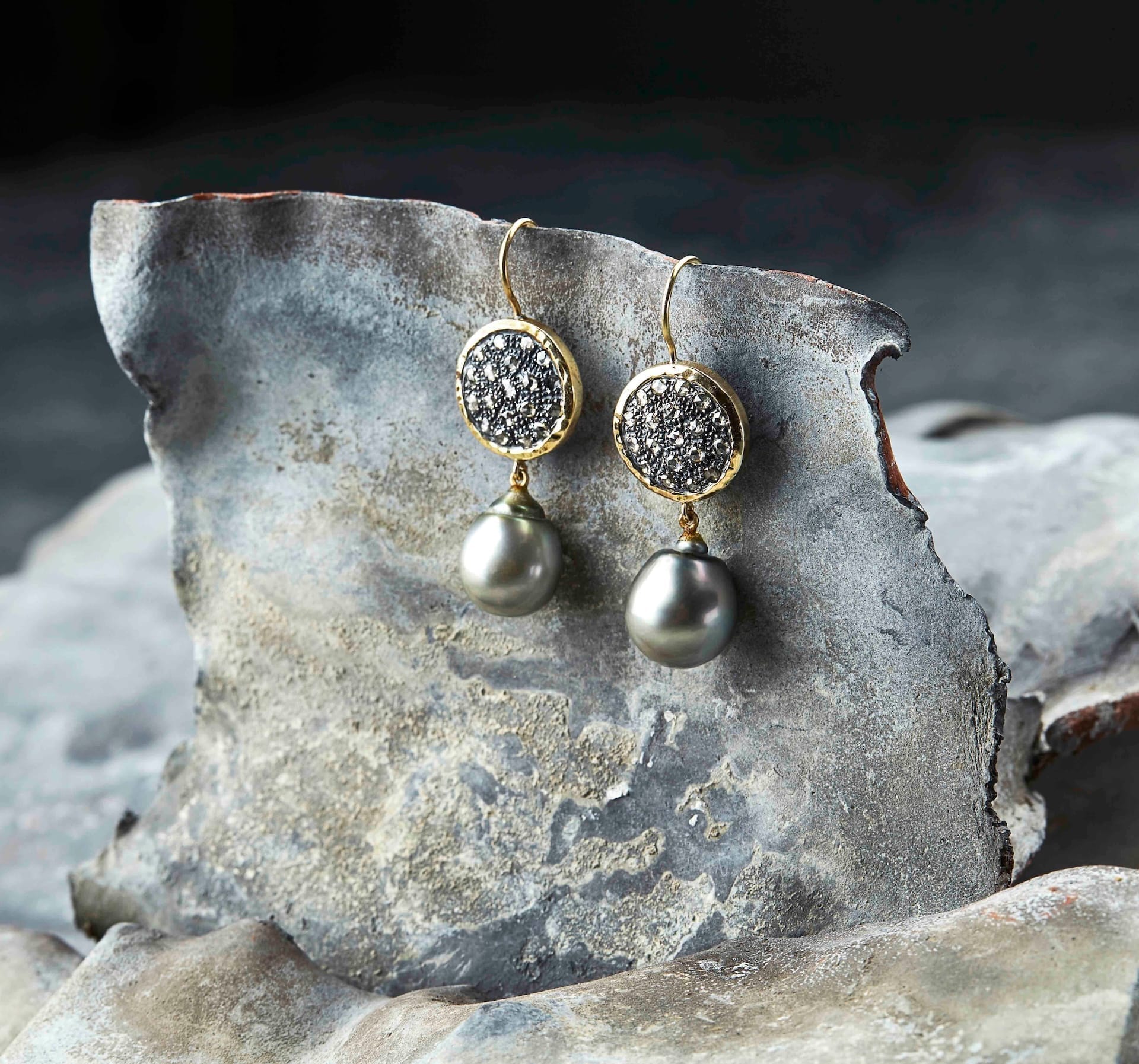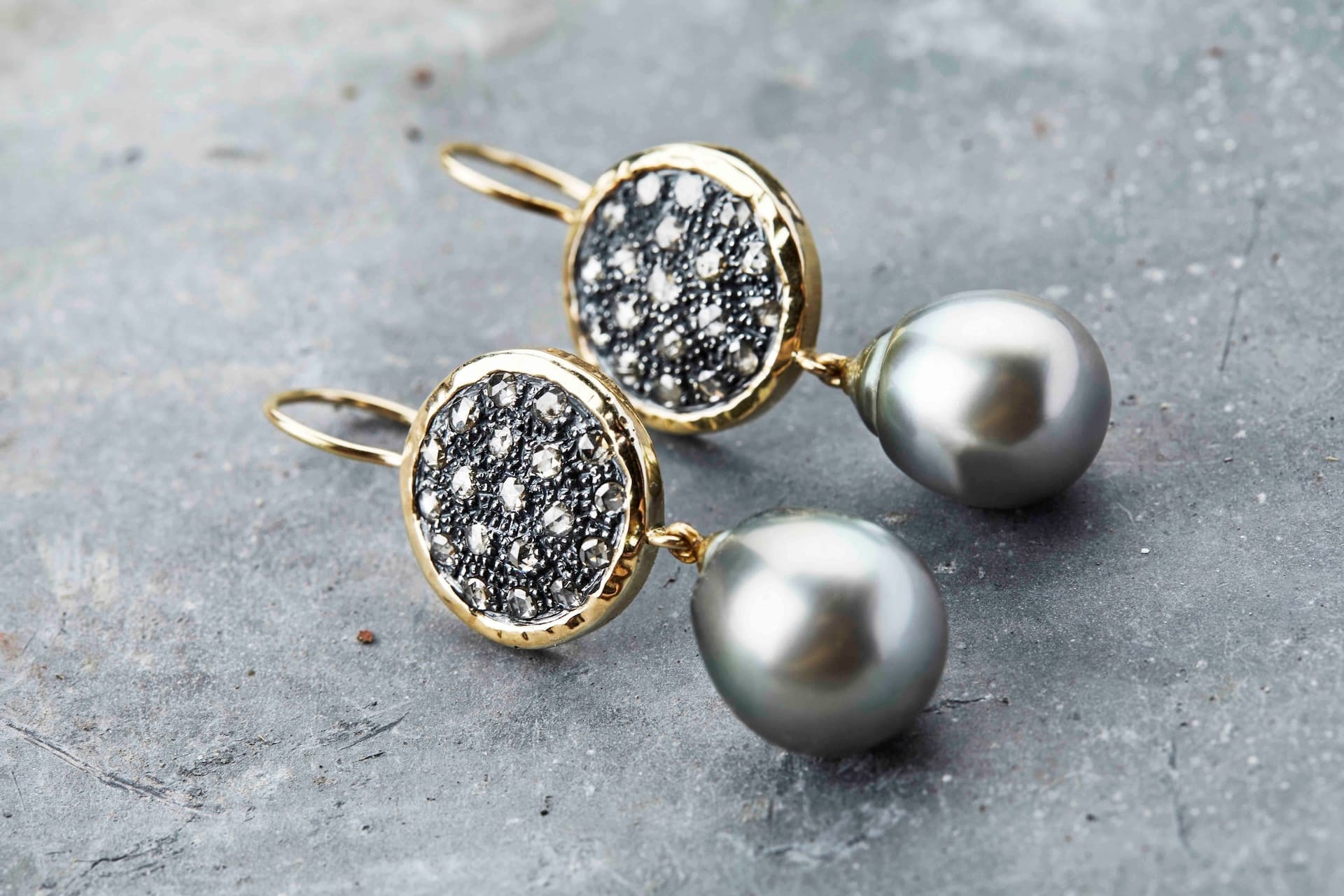 Handforged in 925 sterling silver and 14 karat gold with tahiti pearls and rose cut diamonds (1.30ct).
