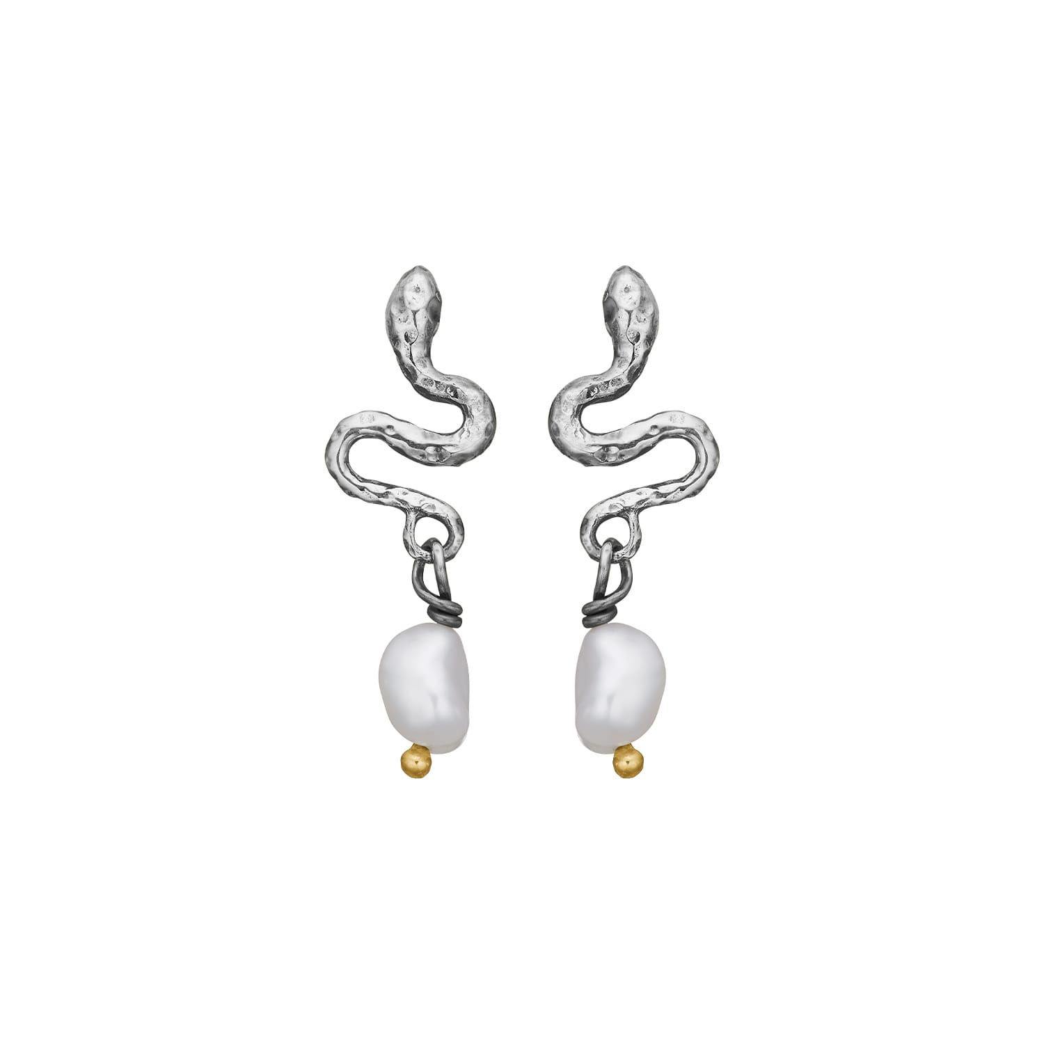 Små slange ørestikkere med hvide keshi perler fra vores Serpent kollektion. Lavet i sterling sølv, med en trådet keshiperle der er pænt afsluttet med en 14 karat guld kugle.