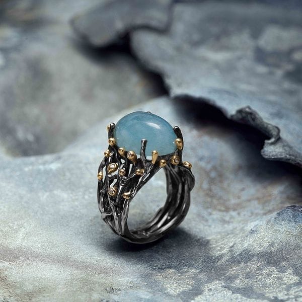 Ringen Ponte Aqua, er den flotteste akvamarin ring, som er håndsmedet af individuelle sølv wires, som griber, om en stor flot naturlig cabochon akvamarin.
